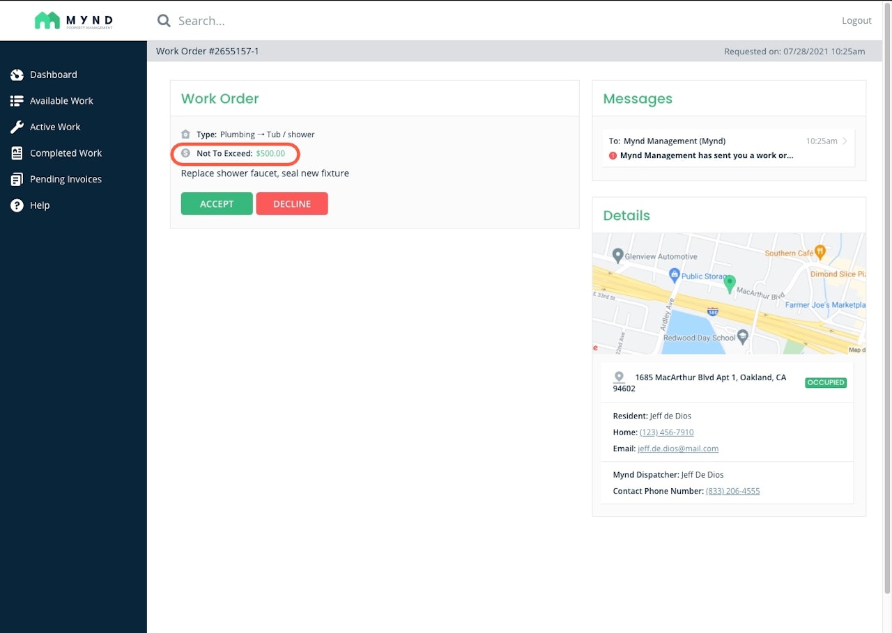 The Not to Exceed (NTE) limit will appear in the work order you receive. If you expect work to exceed the NTE, please contact us prior to completing work so that we can coordinate with the property owner for approval. You also can call for onsite approval at 833-206-4555. Please invoice appropriately and fairly if the work falls below the NTE.