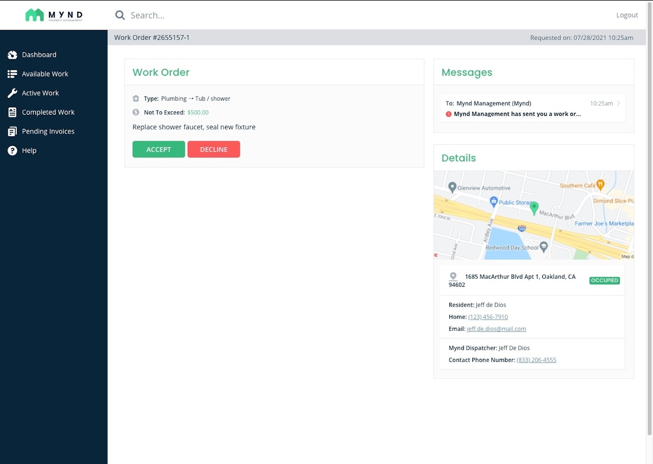 When Mynd has a work order for you, we will display the work order on your online Vendor Portal. You will also receive an email and text message to notify you of a new work order.