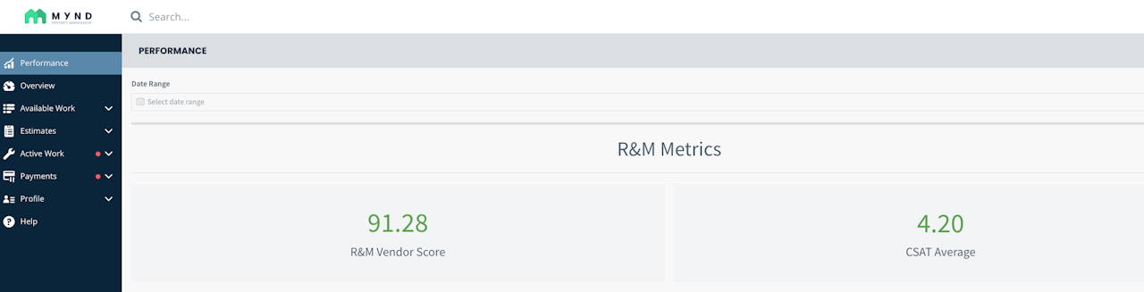The Mynd Vendor portal allows you to access all relevant information regarding active and completed work orders assigned to you. Additionally, you can view your performance metrics, payment status and profile details.